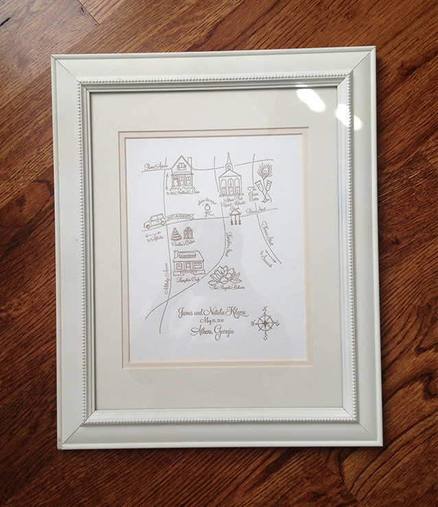 The most sentimental piece I've made to date is probably the first anniversary gift I gave my husband. Since year number one is supposed to be a paper gift, I thought it should be something I created. In the first year we were married, my wedding maps had really taken off, so I decided we should have our own map commemorating our wedding day in Athens, Georgia. I worked with Liz of Blush Design Studio to create a one-of-a-kind letterpress map, complete with the spot James proposed, the church where we were married and a tiny portrait of our house.